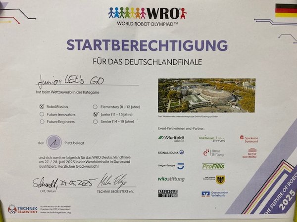 Das Team der Junior LEt´s GO unserer Schule hat sich beim Wettbewerb in Schwedt am 24.05.2025 die Startberechtigung für das Deutschlandfinale erkämpft. Mit Wissen, Geduld und Engagement konnten Thomas (6a) und Ludwig (5b) die Jury überzeugen. Nun geht es in die Finalrunde nach Dortmund. Herzlichen Glückwunsch!