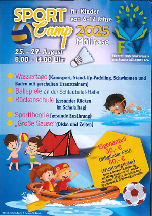Vom 25.- 29.08.25 findet wieder das Sportcamp, organisiert vom Förder- und Sportverein der Schule Müllrose e.V., statt. Es richtet sich an die Altersgruppe 6- 12 Jahre. Anmeldungen erfolgen über joerg.wiedemann@lk.brandenburg.de.